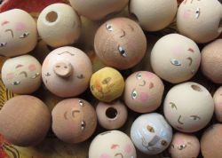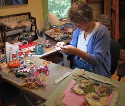 | The character’s faces are painted on wooden beads. | I include beads, shells and other found objects in the fabric relief scenes. | I hand sew every stitch in every illustration. |