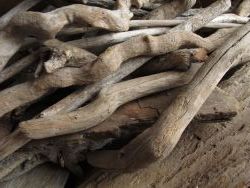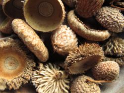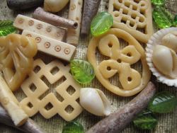 | Some characters in the book have hats made of acorn caps. | I use plant dyed wool felt and multicolored threads to make the pictures. | I like using driftwood to make house roofs and furniture. |
